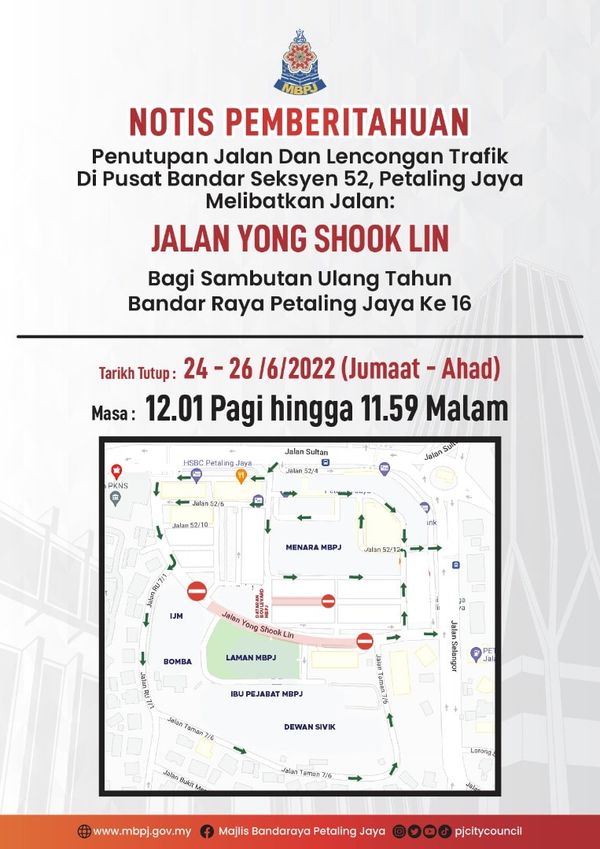 (莎阿南22日讯)八打灵再也配合升格市政厅16周年庆典,从周五起至周日(6月24日至26日),52区的杨旭龄路(Jalan Yong Shook Lin)关闭禁止通车,让路办活动庆典。