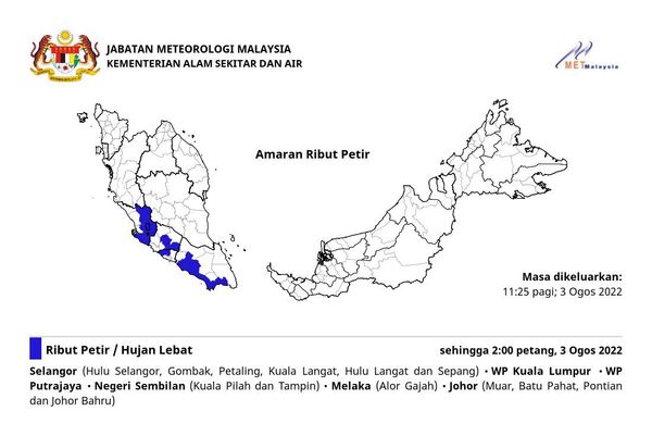 根据马来西亚气象局今日发布的最新天气预告,雪州受影响的地区包括:乌鲁雪兰莪、鹅唛、八打灵、乌鲁冷岳、瓜拉冷岳及雪邦县。吉隆坡和布城也预计测至中午后持续有雷雨。