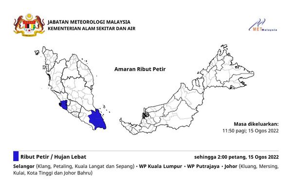 马来西亚气象局于上午11时50分发布天气预测时说,除了雪州4个县区外,吉隆坡和布城同样在这段时间出现雷雨和强风的天气迹象。