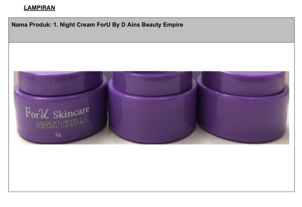 (布城14日讯)“Night Cream ForU By D Ains Beauty Empire”晚霜被发现含有3种列表药物(Racun Berjadual),国家药剂监管机构(NPRA)促请民众勿购买及使用这款美容护肤品。