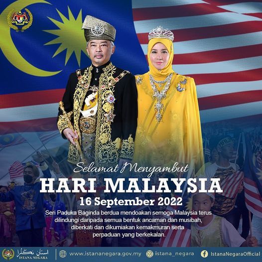 (吉隆坡16日讯)国家元首苏丹阿都拉陛下与元首后东姑阿兹莎今日祝贺全民马来西亚日快乐,并祈求我国继续免受任何形式的威胁与灾难。