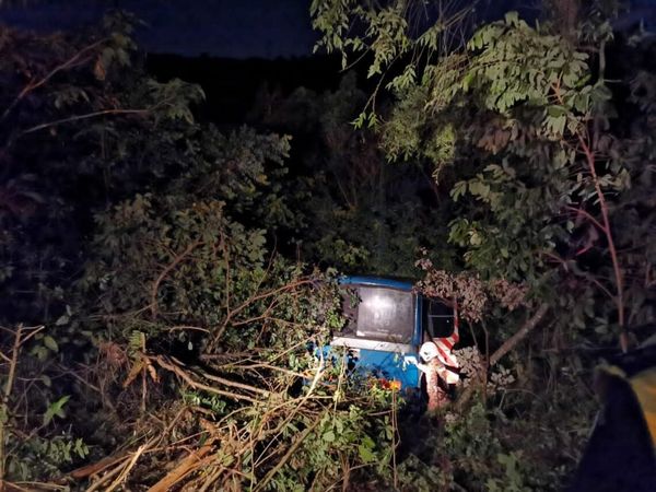 “厂巴掉入山沟后被一棵大树卡住,消拯员敲破车镜救出受困者,拯救行动耗时45分钟。”