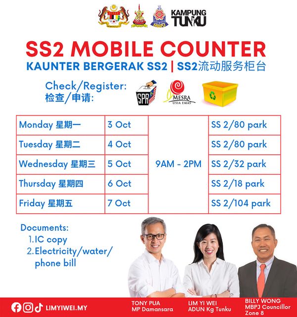 林怡威今日在脸书贴文说,服务中心即日起至SS2各住宅区的公园,从上午9时至下午2时开设流动服务柜台,协助居民检查在来届全国大选的投票资格。