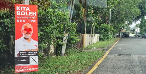 較早前,希盟泗岩沫国席候选人杨巧双開直播,指她的竞选宣传品遭人蓄意破坏,头像全被撕成两半;今次是哥宾星的横幅被涂红漆,脸也遭“毁容”。