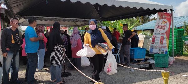 (双溪毛糯24日讯)雪州人民市集食品大促 销古布牙也 (Kubu Gajah )站在村长家前开卖,吸引村内和附近巴也加拉斯逾500多名居民涌来抢购。