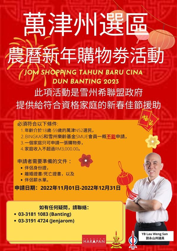 莎阿南11日讯)雪兰莪万津区州议员刘永山表示,雪州政府为万津选民提供农历新年佳节购物券援助,惟申请者必须符合条规。