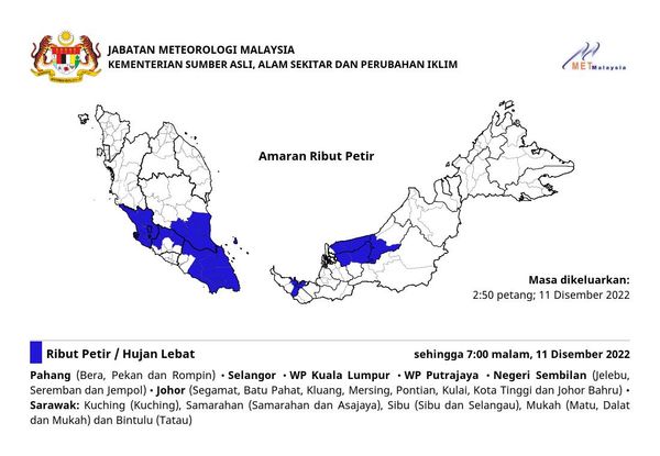 大马气象局今日透过脸书发布的天气预告指出,国内数个地区,包括彭亨、森美兰州、柔佛和砂拉越将受到恶劣天气的影响。