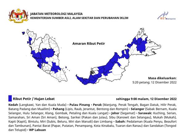 (莎阿南12日讯)马来西亚气象局向数个州属发布雷雨和强风警报直至今晚9时,其中雪兰莪的7个县区料受影响。