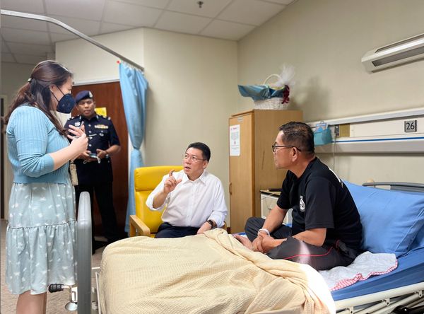 倪可敏今日探访在指挥峇冬加里露营地土崩搜救工作中,因过度疲劳以致轻微中风入院的雪州消拯局局长拿督诺阿占。