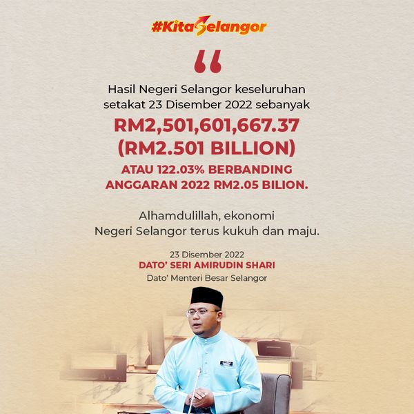 雪兰莪州务大臣拿督斯里阿米鲁丁12月24日在推文中分享一信息图时说,雪州目前的年收入已达到原定的112%,共25亿160万1667令吉37仙。