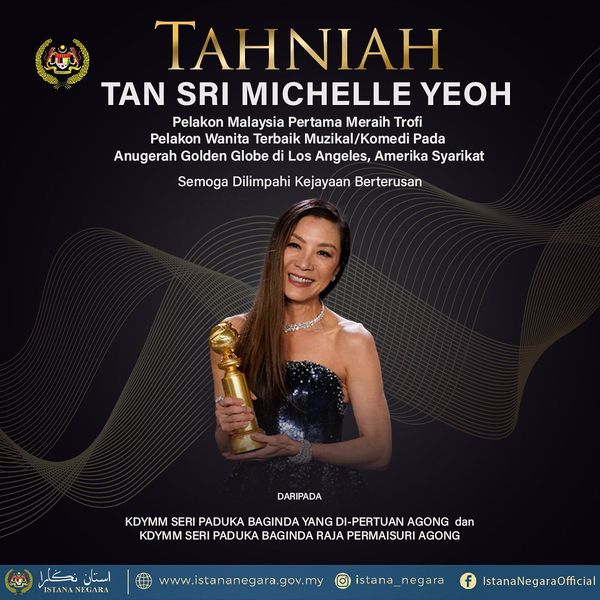 国家皇宫今午5时30分通过官方脸书贴文,指元首伉俪恭贺杨紫琼成为马来西亚史上第一人,在美国举行的颁奖典礼上夺下全球奖影后的殊荣。