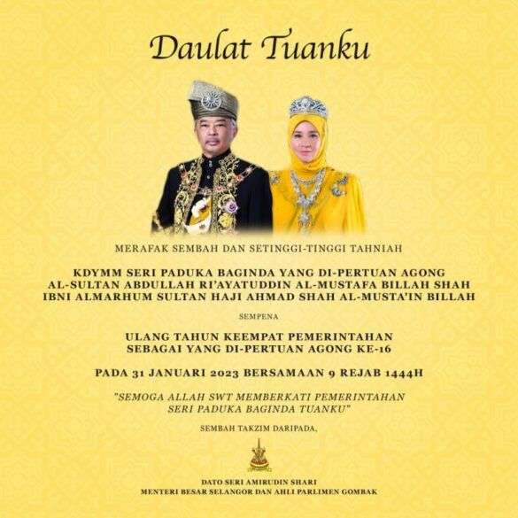 (莎阿南31日讯)雪兰莪州务大臣拿督斯里阿米鲁丁恭贺苏丹阿都拉陛下出任第16届国家元首第4周年庆。
