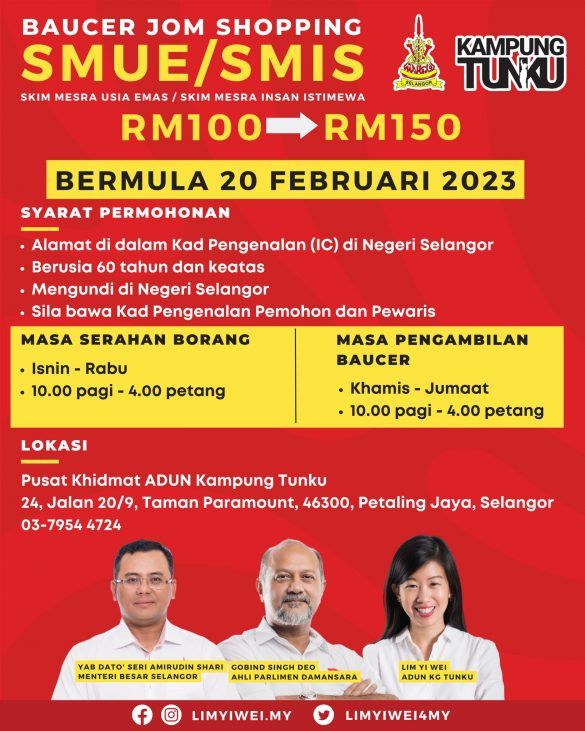 (莎阿南16日讯)甘榜东姑州议员林怡威服务中心将从2月20日开始,开放雪兰莪乐龄亲善基金(SMUE) 及特殊人士亲善基金(SMIS)购物券申请。