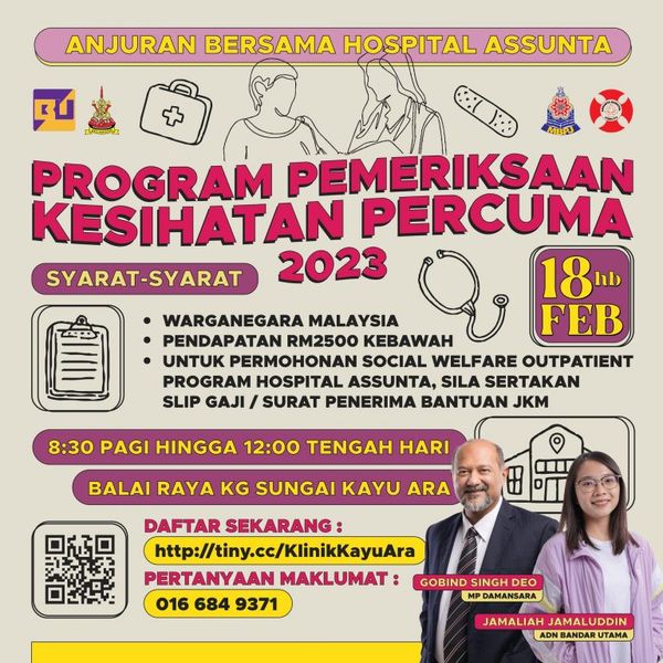 她说,家庭收入低于2500令吉者可直接登记,并可通过线上:http://tiny.cc/KlinikKayuAra 报名。
