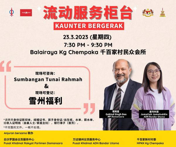 “村民届时可以向团队咨询第一期慈悯援助金(STR)的详情,工作人员也会协助村民申请雪州乐龄亲善基金(SMUE)、雪州特殊人士亲善基金(SMIS)、免费水计划 (SADE)和雪州快乐生活补助金(BINGKAS)。”