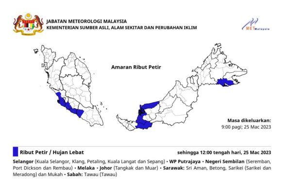 (莎阿南25日讯)雪兰莪的数个县区,今日预计有雷暴、大雨和强风来袭至中午12时。