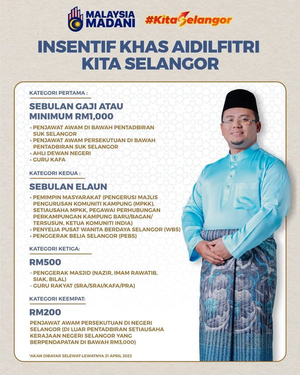 这项开斋节特别援助金最迟在4月21日发放,预计有1万7579名州政厅职员受惠,包括最高管理层、公务员、宗教老师及在雪州服务的联邦公务员。