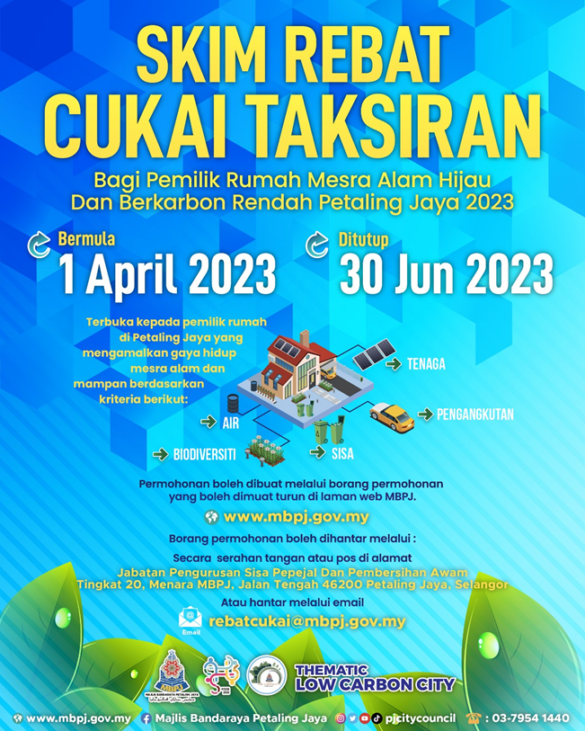 (莎阿南6日讯) 八打灵再也市政厅提供2023年门牌税回扣福利,鼓励市民在生活中贯彻绿色环保及低碳过活,以享有该回扣。