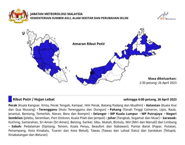 大马气象局在官方脸书发布预告,其他州属数县区有雷暴雨,即霹雳(江沙、下霹雳、巴登马当和慕亚林)、吉兰丹(瓜拉吉赖和话望生),登嘉楼(乌鲁登嘉楼和龙运)。