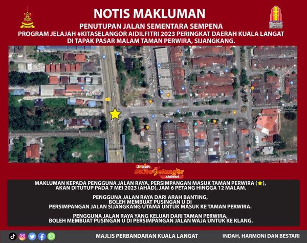 (莎阿南28日讯)瓜拉冷岳市议会(MPKL)配合5月7日的“雪州关爱开斋节巡展”的筹备工作,将暂时关闭管辖区内的数条道路以,吁请市民留意。