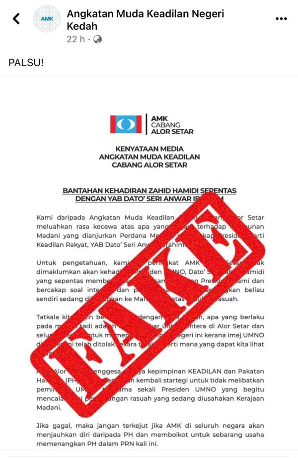 (吉隆坡30日讯)通讯及数码部长法米表示,在Telegram账号“Edisi Siasat”上传以亚罗士打公青团为名,抗议副首相拿督斯里阿末扎希出席吉打2023年昌明集会的声明是伪造的,促请民众别上当。