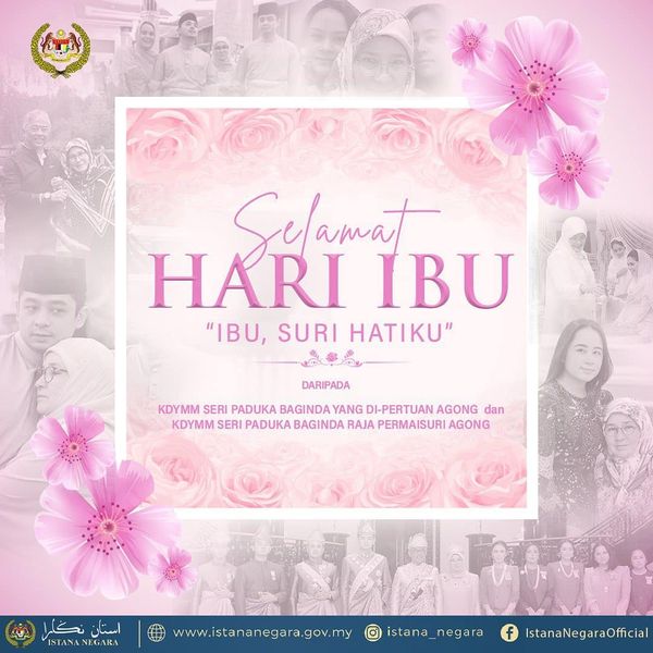 (吉隆坡14日讯)国家元首苏丹阿都拉陛下与元首后东姑阿兹莎祝贺当了妈妈的妇女们,母亲节快乐。 适逢母亲节,元首伉俪通过在国家王宫脸书上载母亲节海报,向全国的母亲们传达祝福。 “母亲节快乐。母亲,我心中的榜样。” 母亲节落在每年五月的第二个星期日。 -马新社-