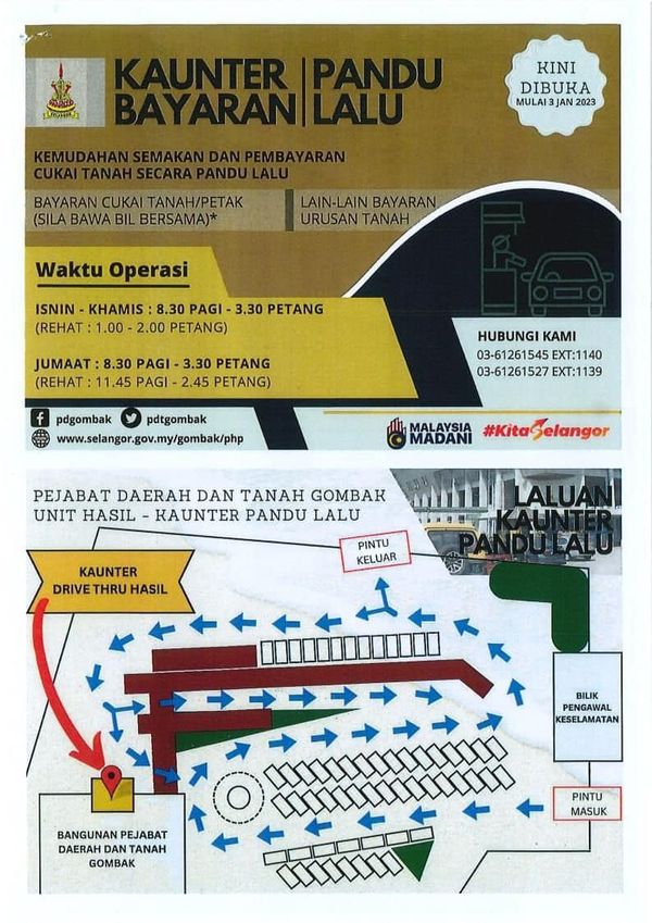 安邦再也市议会在脸书表示,鹅唛县土地局设立的得来速柜台正式启用,开放时段从星期一至星期四的上午8时30分至下午3时30分,午休为下午1时至2时。
