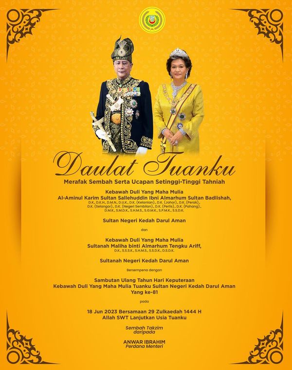 (吉隆坡18日讯)首相拿督斯里安华为吉打苏丹沙烈胡丁殿下81岁华诞献上祝福。