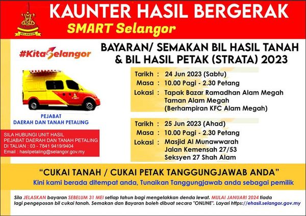 同时,该局也提醒道,从明年1月起,不再邮寄地税单,民众可通过网站https://ehasil.selangor.gov.my 查询或线上线交。