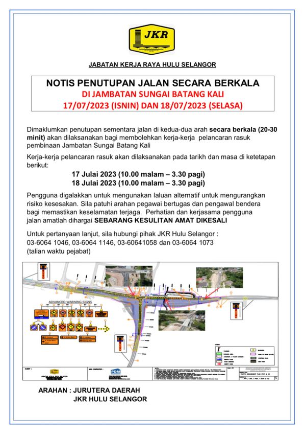 乌鲁雪兰莪县公共工程局脸书发通告指出,该局将在上述时段暂时性,以分阶段的模式封锁双向车道(20至30分钟)。