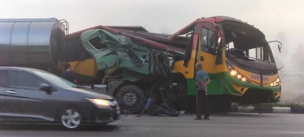 “根据初步报告,事故涉及一辆载着3名乘客的短途下停巴士,相信在驶出交通灯路口时,被一辆从三合港(Chaah) 驶往永平的罗里槽车撞及中间部分。