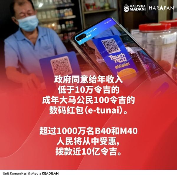(莎阿南27日村)首相拿督斯里安华宣布,政府同意向所有年收入少过10万令吉的大马成年人,提供100令吉的电子钱包现金。