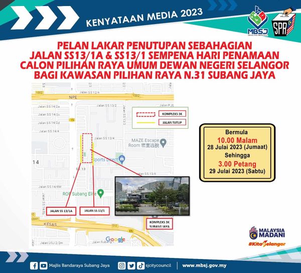(莎阿南28日讯)配合明日(29日)的雪兰莪州选举提名日,梳邦再也市政厅(MBSJ)从今晚10时起至隔天下午3时,暂时关闭 SS13/1A和SS13/1路,民众受促留意