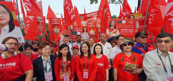 - 9am: 希盟白沙罗国会议席旗下的三名女将,既上阵武吉兰樟州议席的潘佩玲、上阵甘榜东姑州议席的林怡威和上阵万达镇州议席的嘉玛丽雅,在雪州行动党主席兼白沙罗国会议员哥宾星(第二排左)的陪同下,准备步行到万达镇11社区礼堂提名中心。