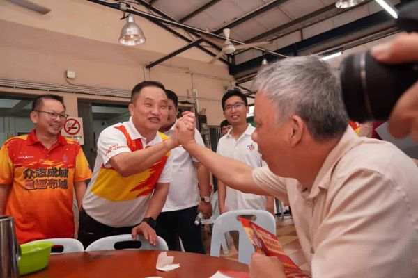 海口渔村居民非常高兴看到黄瑞林的到来,互相拍肩握手问好。(照片:适耕庄民主行动党脸书)[/caption]