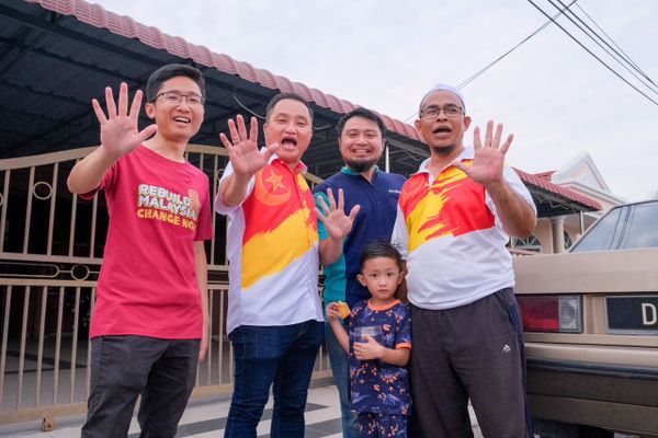 “Give Me Five!”希盟适耕庄州议席候选人黄瑞林(左4)拜访选民时,与选民一起立下第五度担任适耕庄区州议员的承诺。(黄瑞林服务中心提供)[/caption]