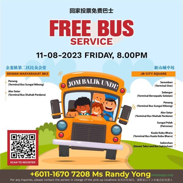 该免费巴士回乡投票只提供单程路线,共两个集合上车点,即金銮镇第二区民众会堂 (靠近LRT Kinrara BK5)和新山城中坊(JB City Square)。免费巴士将于8月11日(星期五)晚上8时正,在上述两个集合点出发到目的地。