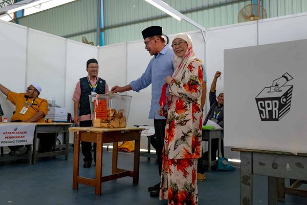 希盟双溪甘迪斯州议席候选人莫哈末查华威与妻子哈兹丽娜今早9时30分,在巴生哥本路国小投票。