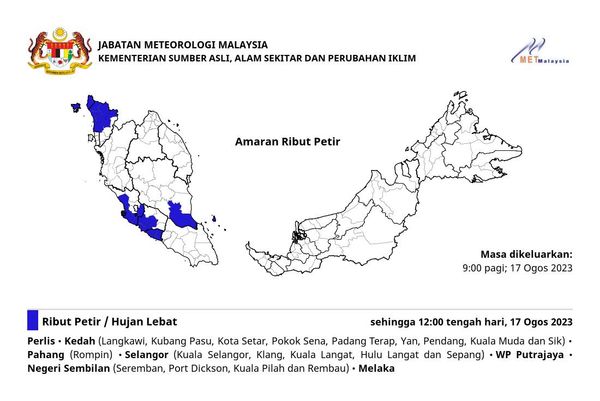 (莎阿南17日讯)雪兰莪5县与布城预计出现雷暴、大雨和强风,至今日中午12时。