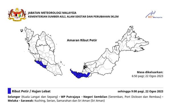 (莎阿南22日讯)雪兰莪州瓜拉岳县和雪邦县,以及布城今早预计有雷暴雨,直至上午9时。