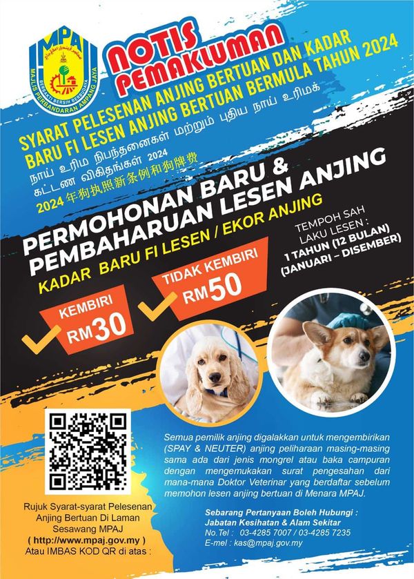 (莎阿南2日讯)安邦再也市议会(MPAJ)为2024年养狗执照制定新收费,有绝育狗只的执照费一年是30令吉。