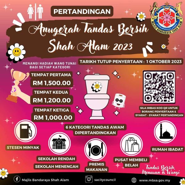 莎阿南市政厅(MBSA)举办“2023年莎阿南公厕清洁比赛”,欢迎管辖区内的各单位踊跃参赛以照顾旗下厕所的卫生,从中提高民众的卫生意识。