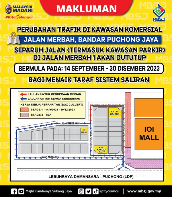 梳邦再也市政厅(MBSJ)在脸书贴文说,工程在9月14日开始至9月30日,因此,将临时关闭一半的道路。