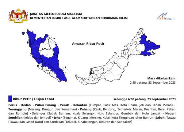 另外,森美兰(日叻务和仁保) ,以及柔佛(昔加末、居銮、丰盛港、古来、哥打丁宜和新山)是局部地区坏天气。