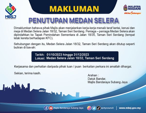 梳邦再也市政厅在脸书发帖指出,位于18/32路的斯里沙登花园美食中心将进行提升工程,因此在上述时段将暂时关闭。