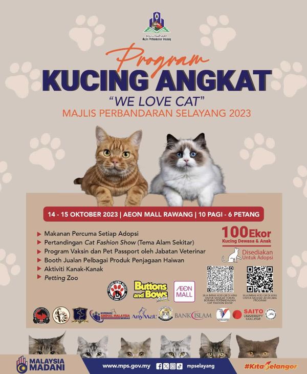 (莎阿南5日讯)士拉央市议会(MPS)与非政府组织从10月14日起一连两天,联手举办2023年“我们爱猫”猫只领养活动。