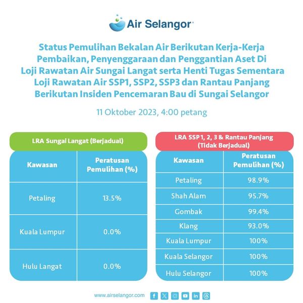 雪州水供管理公司呼吁用户浏览“Air Selangor ”的各个官方管道,包括脸书、X、Instagram或联络热线15300,以获取最新详情。
