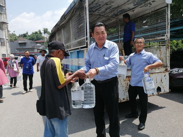 王声宾今午陪同加影州议员张睷洋和雪州水供公司职员,到友友花园组屋派5公升装的饮用水给居民后,向记者这么说。