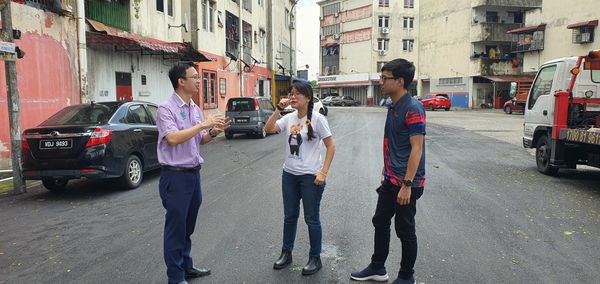 王诗棋(中)巡视和谐英达组屋的沟渠问题,右是王诗棋特别助理郑铭杰。(当今雪州图片)[/caption]