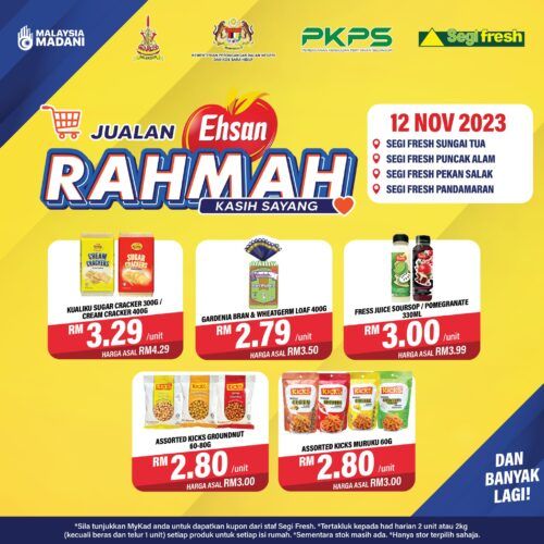 (莎阿南12日讯)雪州农业发展机构(PKPS)与Segi Fresh连锁超市合作,今日将在雪兰莪的4家超市举办益山慈悯促销,欢迎民众前来采购便宜的日常用品和食材。